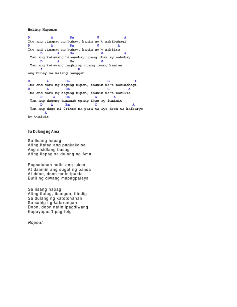 Buhay na laan nang lubos. Intro DF G DF G Fm Bm Em Asus D Chorus D GD D GD Ikaw Hesus ang tinapay ng buhay Bm EG A AG Binasbasan hinatit inialay DF G DA FA Bm7 Buhay na ganap ang sa amiy kalo ob Em Asus D GA At pagsasalong walang hanggan Verse 1 D GD D GA Basbasan ang buhay. A collection of praise and worship songs with piano keyboard or guitar chords in English and Filipino.